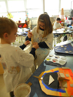 Recently 3rd grade artists learned about the spectrum of light. They memorized "rainbow order" with the help of an old mnemonic device - "Roy G. Biv" and a song and video of the same name by the group They Might Be Giants. (see the video on our Studio 101 Facebook page!) First we made rainbow spirals to get some practice:
